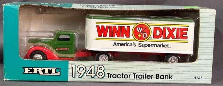 ERTL die-cast metal 1948 Winn-Dixie tractor trailer bank in 1/43 scale. Features include a detachable trailer, rubber tires, locking coin bank with key, and branded graphics reading ‘Winn-Dixie America’s Supermarket.’ The truck and trailer are approximately 10 in. long.