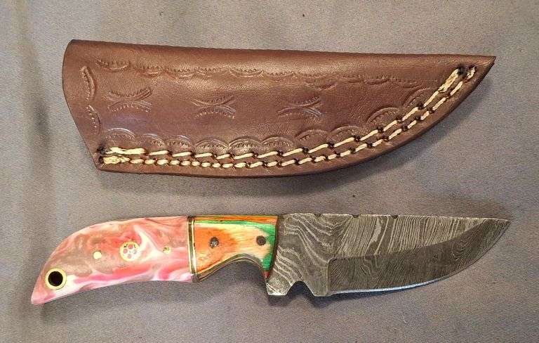 LOT 171 - Damascus steel blade knife with wood & resin handle & Sheath, 3” blade