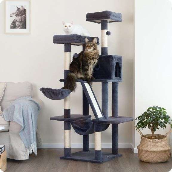 LOT 291843 - OURITSU - Ouritsu Cat Tree, 61 inch Tall Cat Tower for Large Cat Indoor, Enlarged Condo, 2 Padded Perches with 1 Widened, Large Hammock, S