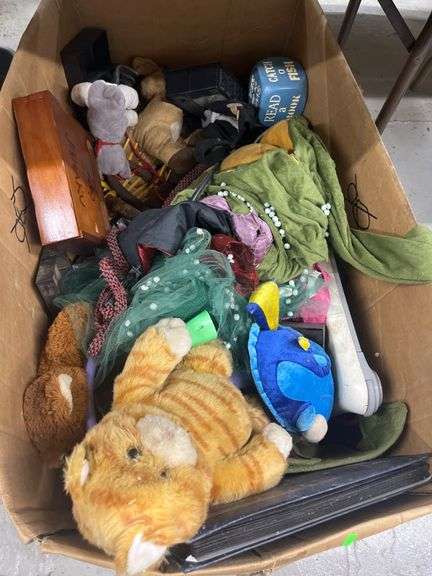 Box containing an assortment of items, including plush animal toys (e.g., a striped cat and brown teddy bear), a Jishaku board game, green and sheer fabric pieces, a blue fish-themed ceramic or plastic container, and various other items such as tools and decorative objects.