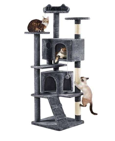 Yahee Tech dark gray 70-inch cat tree constructed with particle board, plush fabric, and sisal-wrapped scratching posts.