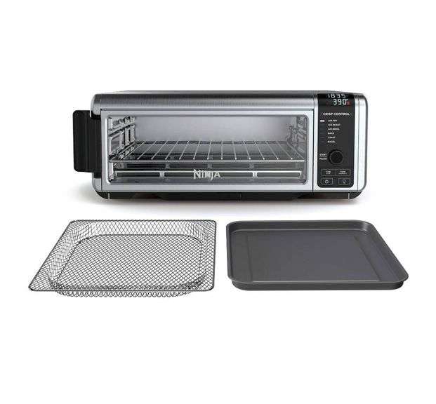 Ninja Foodi 6-in-1 flip-up air fryer toaster oven, model SP080. Features air frying, roasting, broiling, baking, toasting, and dehydrating functions. Includes wire rack, sheet pan, and removable crumb tray.