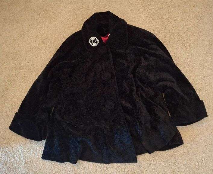 Black faux fur coat featuring a striking red satin lining and a decorative brooch affixed to the front lapel. Includes wide folded cuffs on the sleeves and a flowing silhouette. The closure at the front utilizes buttons, and the coat is fully lined. The brooch design incorporates rhinestone accents.