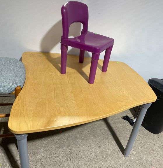 Includes 1 child-sized chair made of purple plastic and 1 table with a light wood-laminate top and tubular gray legs. The chair features a curved backrest and reinforced construction.