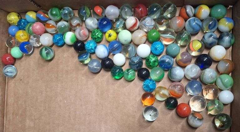 Clear jar containing various glass marbles of different colors and patterns, such as swirls, solids, and transparent designs. The jar is sealed with a metal screw-top lid stamped with ‘Hand Cln’ and ‘Guaranteed.’ Approximately 9 in tall. Additional loose marbles of similar variety included.