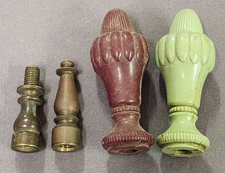 4 finials crafted from brass and plastic, measuring 1.5″-2.5″ in height. The lot includes 2 smaller brass finials with threaded bases and 2 larger plastic finials in red and green hues with threaded fittings.