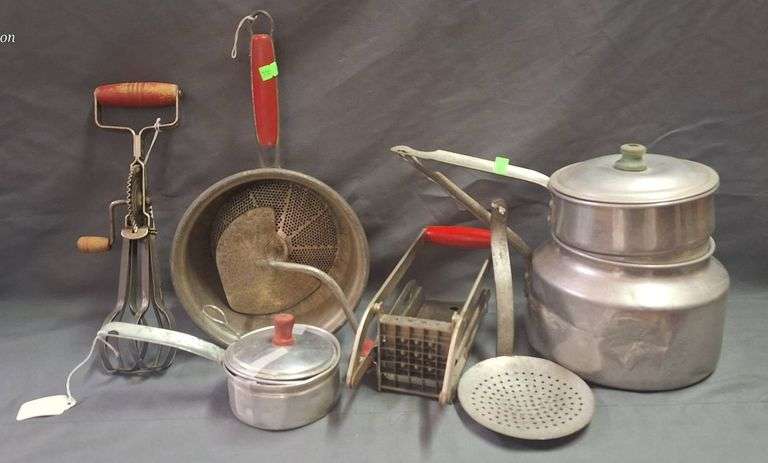 Metal kitchen items including a hand-crank egg beater, double boiler, strainer, food mill