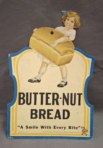 Cardboard advertising sign for Butter-Nut Bread featuring the slogan “A Smile With Every Bite.” The design includes an illustration of a child holding a loaf of bread. Measurements are approximately 10x7in. Manufactured by Schulze Advertising Service Bakery Advertising, Chicago, as indicated at the bottom of the sign with “Made in U.S.A” printed.
