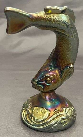 Fenton carnival glass fish sculpture featuring a vibrant iridescent finish. The fish stands upright on a decorated base that incorporates wave motifs. The underside is marked with detailed designs, showcasing the craftsmanship.