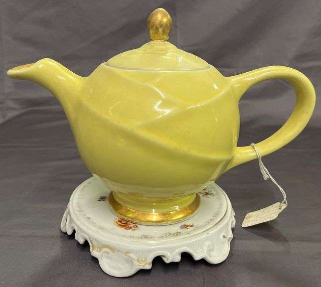 Hall 0219 marked yellow teapot with swirl pattern design and gilded accents, including lid finial and base trim. Marked as 6-cup capacity, made in the U.S.A. Paired with a porcelain pedestal base featuring floral design and gilded details, stamped ‘Victoria Carlsbad Austria’ on the underside. Teapot measures approximately 6” tall.