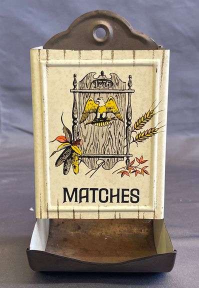 Wall-mountable metal match holder featuring a printed design on the front panel. The design includes a decorative motif with birds, flowers, and the word ‘MATCHES’ in bold lettering. The piece has a top hole for hanging and an open-front tray for holding matches. Measures 6″ in height.