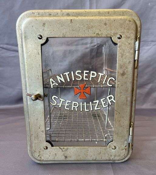 Metal and glass antiseptic sterilizer measuring 11x7x9. Features a hinged metal front with a glass panel, marked ‘Antiseptic Sterilizer’ with a red cross emblem. Includes 2 removable wire racks inside and rests on small feet.