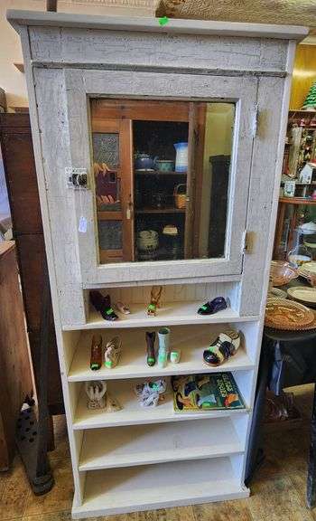 Freestanding cabinet featuring a mirrored door with a hinged frame and 4 open shelves below, painted white with distressed detailing. Overall dimensions are 29.5″x12″x66″.