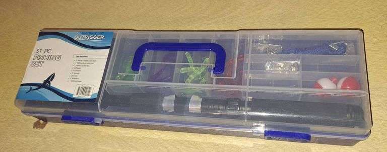 Outrigger fishing kit containing 51 pieces, including a collapsible fishing rod, reel, hooks, lures, and other accessories. Packaged in a durable plastic storage case with a carrying handle and slots for organizing gear. The rod features a foam grip and metal reel seat. The case measures approx. 14 in. x 5 in. x 2 in. and is labeled with details of included items.