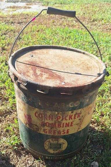 Metal pail with printed label advertising Corn Picker Combine Grease by National Product. The pail features a handle attached to the sides and visible surface oxidation. The label displays the product name in red text and additional branding details.