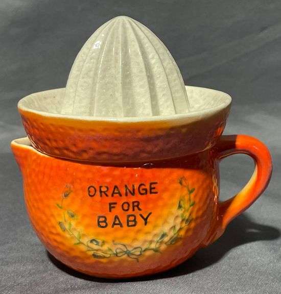 Orange citrus juicer featuring a ridged reamer and a matching juice-collecting vessel with a spout and handle. The vessel front is decorated with the text ‘Orange for Baby’ alongside a floral pattern. The base has a maker’s mark and visible crazing. Measures approximately 4.5 in tall and 4 in wide (including the handle).