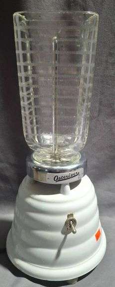 Osterizer Model 10 electric blender manufactured by John Oster Mfg. Co., Milwaukee, WI, USA. Features a ribbed white base with a chrome band branding plate. Includes a clear glass jar with ridged texture and integrated stainless steel blades. Operates with a toggle switch. Bottom plate markings confirm the model and wattage (22 watts). No lid.