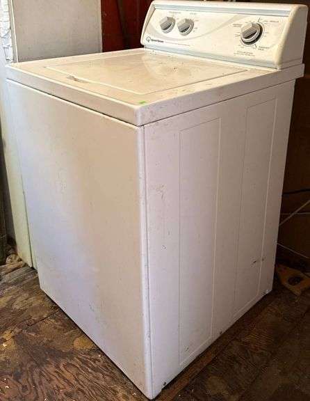 Speed Queen top-load washing machine with mechanical controls. Model AWN311SP111TW01 manufactured by Alliance Laundry Systems LLC. Exterior measures 25.5x28x43 inches. Features cycle selection, load size, and water temperature dials. Electrical and water connections intact. Serial number 0909021408 displayed on label.