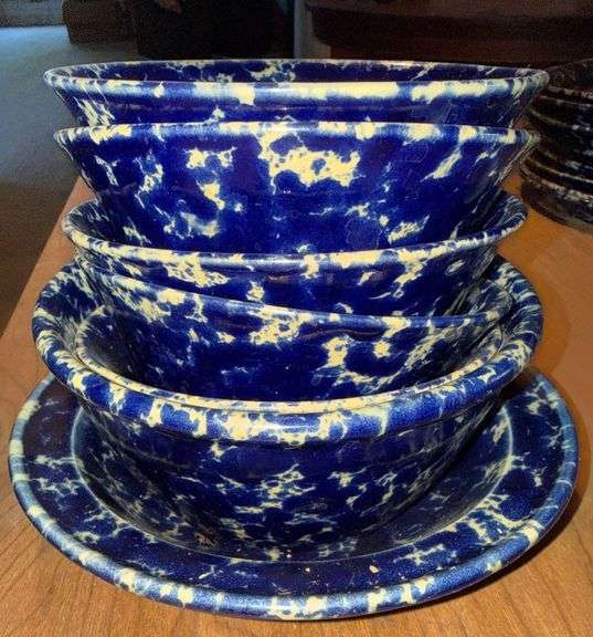 4 blue and white spatterware bowls handcrafted by Bennington Potters of Vermont. Each bowl features a distinctive glaze pattern. Base of each piece is stamped 'Bennington Potters,' '661,' and 'Bennington, Vermont.'