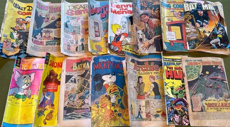 Comic books featuring diverse characters and publishers. Includes titles such as Batman, Marvel Super-Heroes, King Comics, Mighty Mouse, Walt Disney's Mickey Mouse, Dennis the Menace, and Archie. Covers and pages show evidence of wear, creases, and discoloration. Sold as a compilation from various publishers and issue numbers.