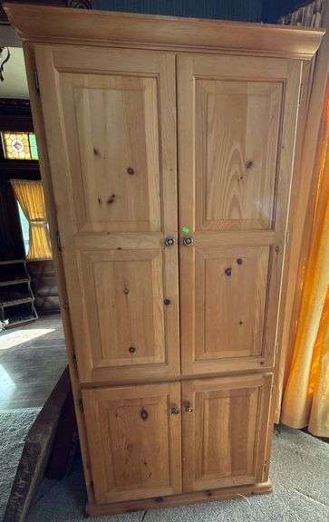 Pine storage cabinet measuring 77.5”x35.5”x24”. Features four paneled doors with metal hinges and knobs. The interior includes adjustable shelves and a pull-out platform. Exhibits natural wood grain with visible knots. Side panels are solid.