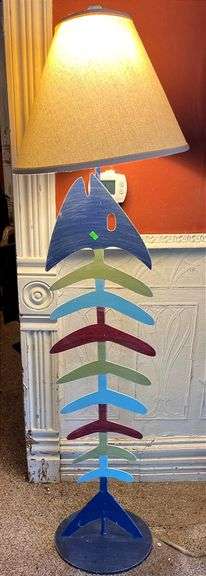 Floor lamp measuring 61” in height featuring a metal structure in a stylized fish skeleton design with multicolored elements. Topped with a beige fabric shade, the lamp has a circular base for stability.