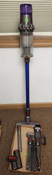 Dyson stick vacuum cleaner featuring a cordless design with a rechargeable battery. Includes multiple accessories such as additional brush heads, crevice tools, and an attachment holder. The unit appears to be pre-owned and shows signs of prior use. Sold as is with no returns.
