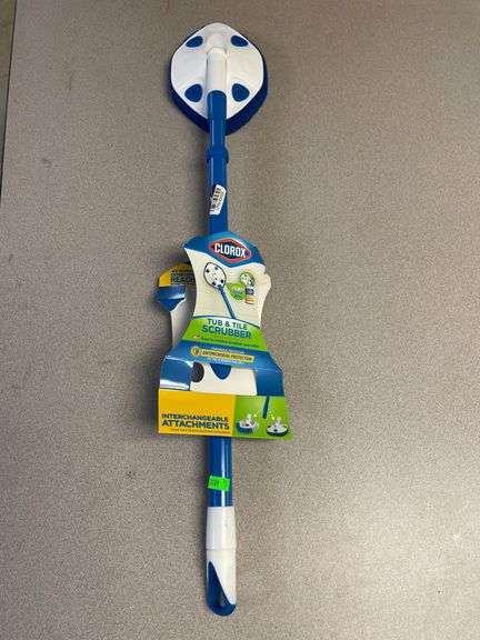 Clorox-branded tub and tile scrubber featuring an extendable handle for reaching high and low cleaning areas.