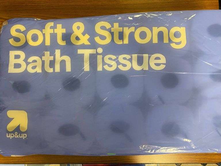 Package of 30 rolls of bathroom tissue labeled as 'Soft & Strong' under the Up & Up brand. The product is sealed in a blue plastic wrapper.
