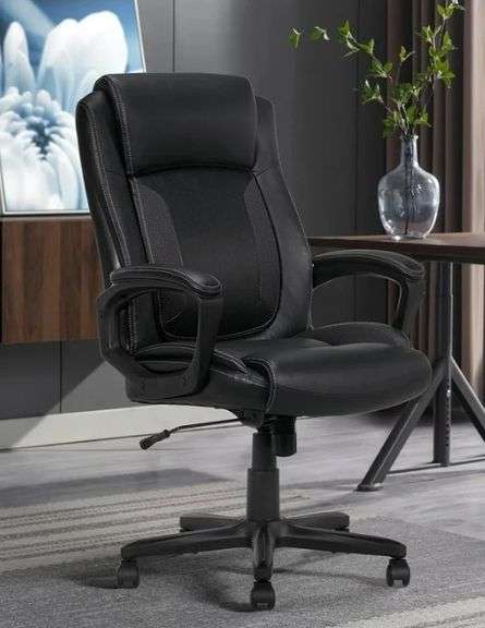 Black office chair featuring a padded vegan leather backrest and seat 5-wheel polyurethane base for mobility. Adjustable height and tilt mechanism for ergonomic use.