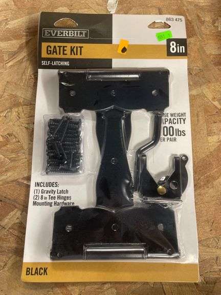 Everbilt 8-inch black gate kit featuring a self-latching mechanism for secure closure. Includes 1 gravity latch, 2 T-hinges, and mounting hardware.