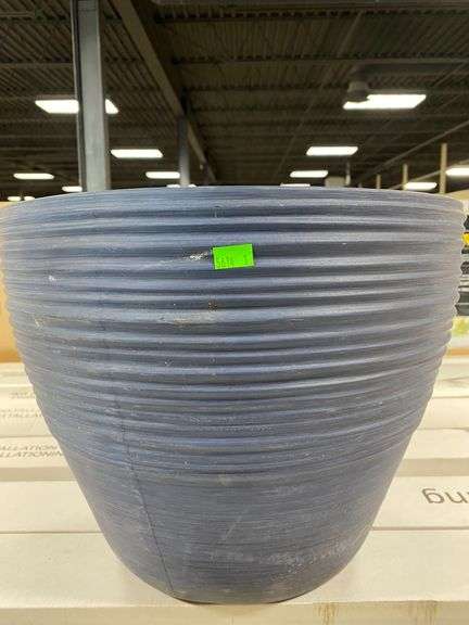 Blue garden planter featuring a ribbed exterior. The planter is suitable for outdoor or indoor use and exhibits minor surface wear from prior use.