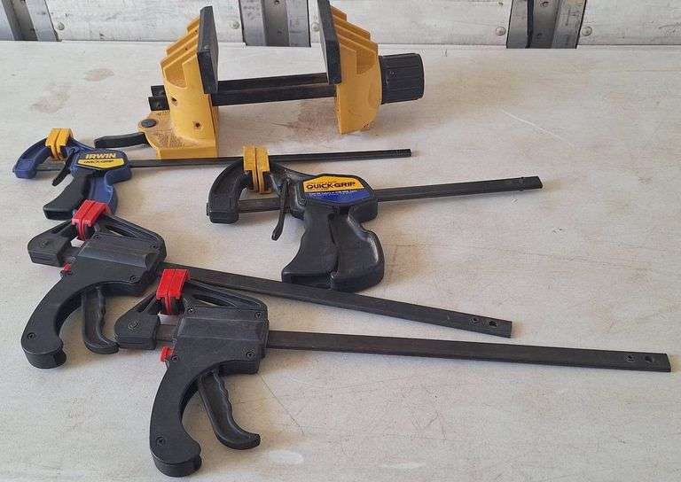 Includes 5 bar clamps with various trigger mechanisms and plastic jaws. Yellow and black designs from Irwin and similar brands.