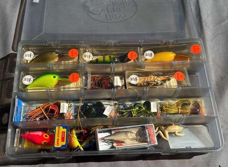 Fishing tackle box measuring 14 x 9 with a selection of various fishing lures and accessories, including crankbaits, jigs, and soft plastic baits. Box features a transparent lid for easy viewing.