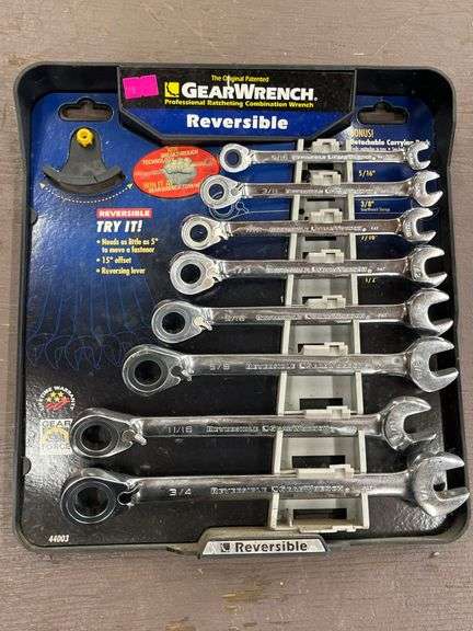 GearWrench SAE reversible ratcheting combination wrench set, 5 wrenches in various sizes (5/16-3/4), with a detachable carrying tray. Made in the USA.