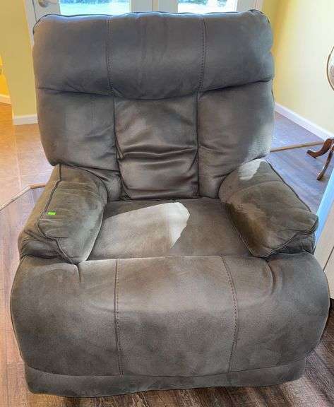 Catnapper power recliner upholstered in brown fabric. Includes remote with controls for recline, heat, massage, and lumbar support. Dimensions: 36”x32”x33”.