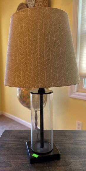 Lamp featuring a black rectangular base, clear glass cylinder, and patterned fabric shade. Stands 19” high.