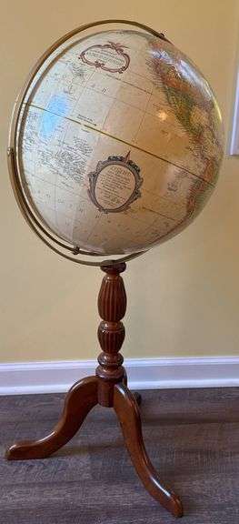 Replogle World Classic Series globe with a 16-inch diameter and 38-inch floor stand. Features a wood tripod base and a metal meridian with latitudinal markings.