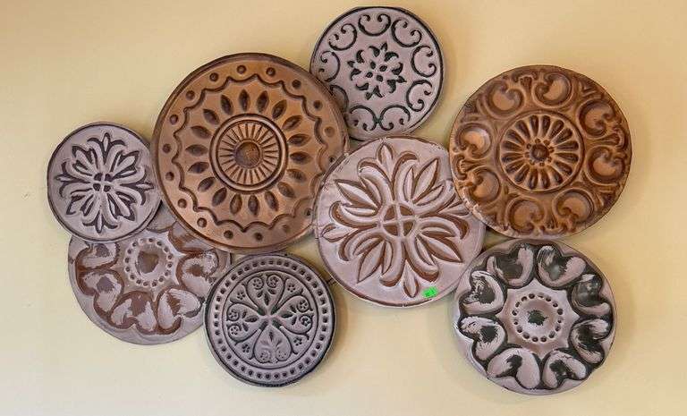 Wall hanging featuring 8 interconnected circular metal panels with embossed patterns. Dimensions are 36”x24”x2”. Designed with a built-in frame for wall mounting.