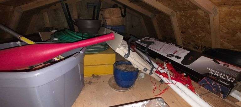 Includes basketballs, a bat, volleyball net, garden hose, and blue planter,
