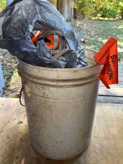 White plastic bucket holding orange and gray nylon straps, nails, wood pieces, and other miscellaneous materials. Shows signs of previous use with some visible dirt and wear.