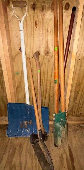 Gardening tools Inc. a metal snow shovel, a scythe, a hoe, and a rake with wooden handles. Age-related wear is visible.