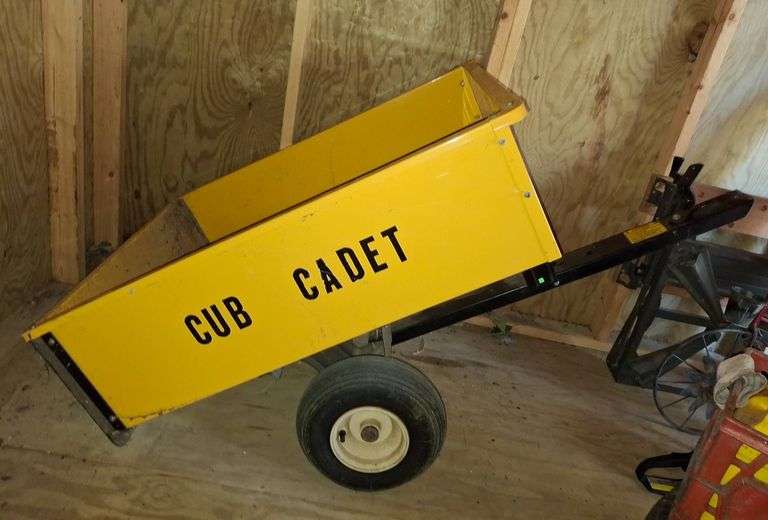 Yellow Cub Cadet metal utility yard cart featuring a two-wheel configuration and hitch attachment. The cart shows signs of use, including dirt and wear on the interior bed.