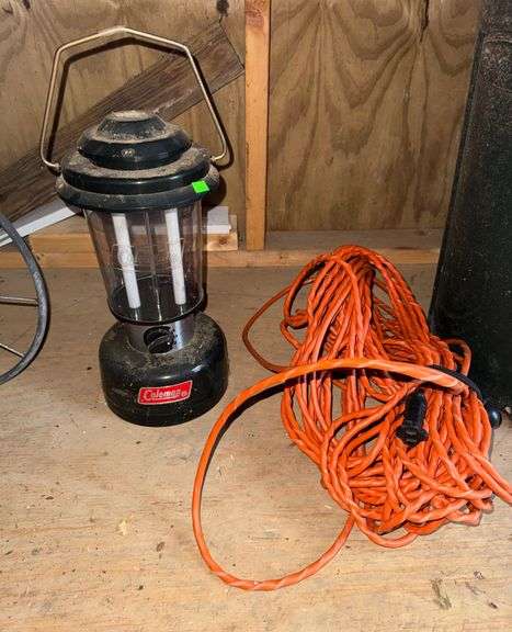 Coleman 18” fluorescent lantern, model 5355-700, with 12V plug and an orange extension cord included. Lantern displays some use-related wear. Extension cord shows visible wear with one damaged connector.