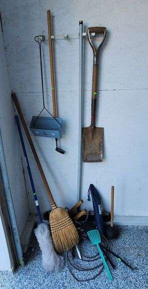 Includes broom, dustpan, shovel, plunger, duster, metal hanging rack, wood handles, small tools, umbrella, and carrying bag. Items show wear consistent with use.