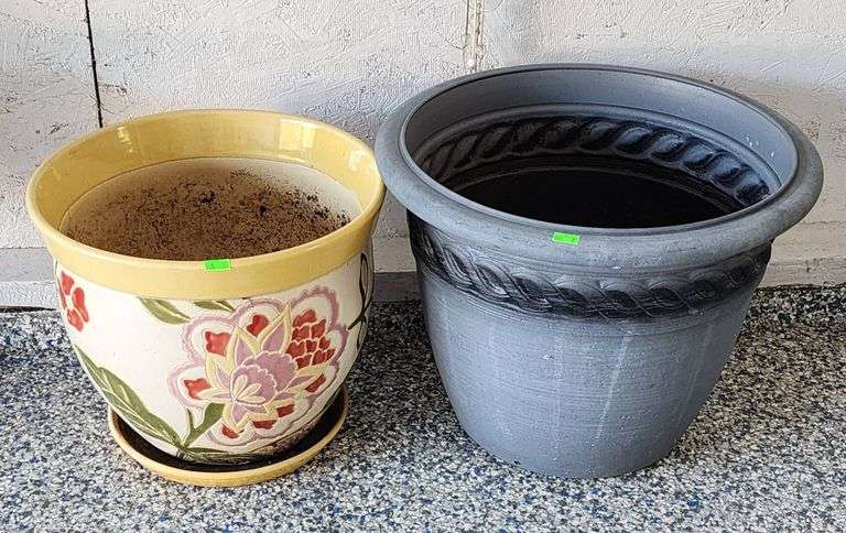 Yellow pot with floral motif and saucer, 12″x11″. Gray plastic planter with leaf border design, 16″x12″.