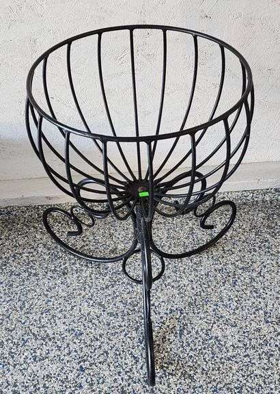 Black metal basket stand featuring a wireframe bowl and scroll-patterned tripod base. Dimensions are 22″x25″.