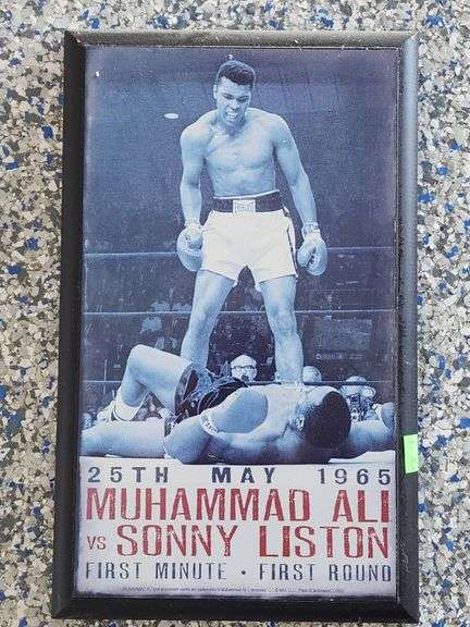 8″x13″ MDF wall art depicting Muhammad Ali vs. Sonny Liston, dated May 25, 1965. Manufactured by Square One Brands LLC for Hobby Lobby. Includes rear hanging hardware.