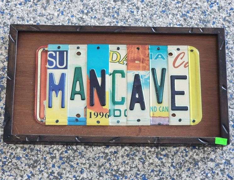 Rectangular wall art measuring 16"x9", featuring a colorful design made from repurposed license plates spelling out "Man Cave." Housed in a wooden frame with visible wear. Back includes mounting hardware.