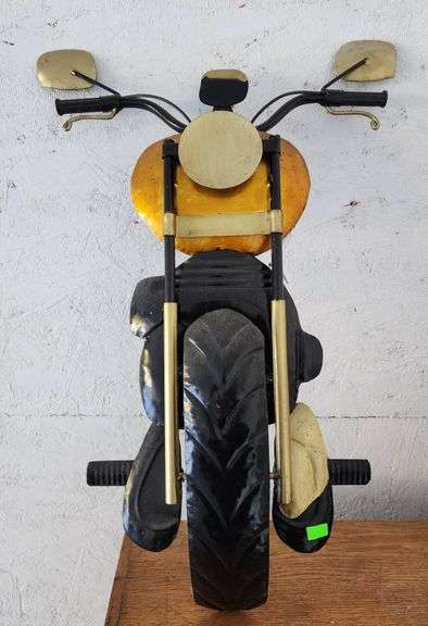 Metal motorcycle figurine featuring a front-facing design with dual-tone yellow and black finish. Measures 14"x23". Notable details include mirrors and handlebars.
